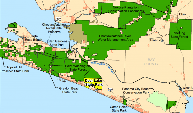 Located on CR-30A and with a beautiful quarter-mile dune walkover and half-mile beachfront, Deer Lake State Park may be thought of as a beach park. However, most of the park, about 1,900 acres, is located north of CR-30A.