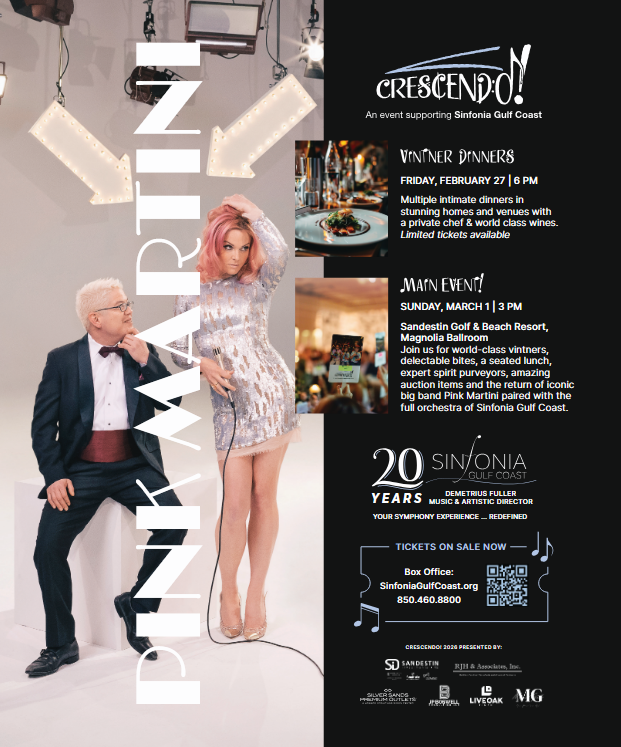 As a reminder, Crescendo! 2026 unfolds as a three-part celebration of culture, cuisine, and community. Festivities kick off Friday, Jan. 23, with the Crescendo! Kick Off Lunch at Hotel Effie. The celebration continues Friday, Feb. 27, with a series of exclusive Vintner Dinners hosted in elegant homes and venues throughout the Emerald Coast. The weekend culminates with the Signature Crescendo! Main Event on Sunday, March 1, featuring Pink Martini live with the full Sinfonia Gulf Coast orchestra.