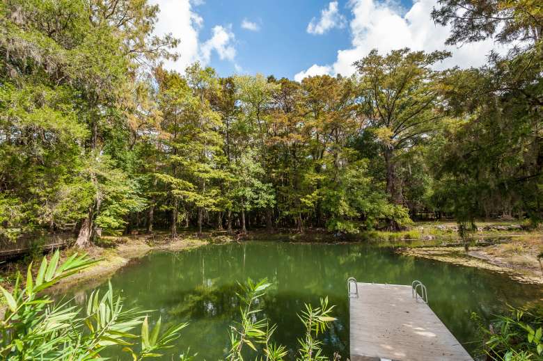 Located near the campground, the Blue Hole Spring rises to create the Blue Hole swimming area. This favorite warm weather attraction provides a great way to cool down during the hot summer months. The spring water is usually clear during periods of low rainfall. A floating dock extends out over the spring vent to provide bathers access to the swimming area. Two bridges on the North & South ends of the swimming area are good locations to view wildlife and enjoy the surrounding scenery. The spring vent has been measured at 97 feet deep and during periods of heavy rain; flood waters may rise more than 10 feet above normal levels.